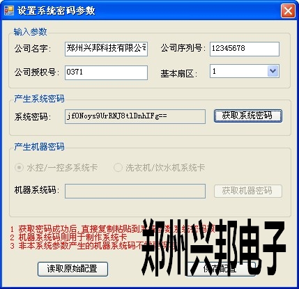 4) 系統(tǒng)密碼:跟卡的加密有關(guān),單擊【設(shè)置密碼】出現(xiàn)圖5 輸入卡的加密參數(shù)(根據(jù)公司所提供的信息填寫),單擊【獲取系統(tǒng)密碼】,單擊【保存配置】。將獲取的密碼粘貼到系統(tǒng)密碼后面的空白處。再次打開該窗口時(shí)可以單擊【讀取原始密碼】,獲得卡的加密信息。