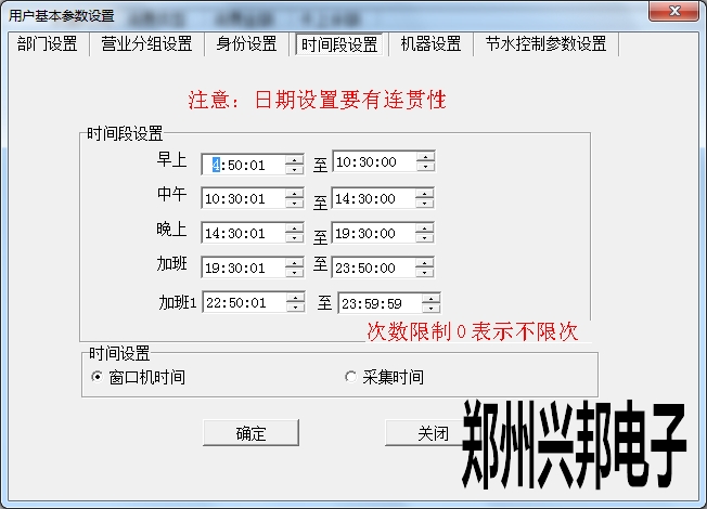 在使用興邦一卡通平臺用戶基本參數設置中有部門設置、營業分組設置、身份設置、時間段設置、機器設置、節水控制參數設置。下面依次為其說明。