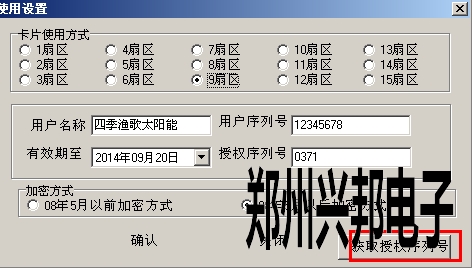 2.雙擊后出現(xiàn)下圖所示的界面,點(diǎn)擊該界面右下角的【獲取授權(quán)序列號(hào)】按鈕,即可讀出當(dāng)前數(shù)據(jù)庫(kù)中的設(shè)置,包括 使用扇區(qū)、用戶名稱、用戶序列號(hào)、授權(quán)序列號(hào)、加密方式