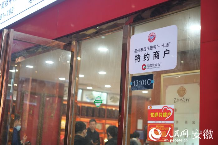 作為全國最大的中藥材集散地,亳州擁有“千家藥企、十萬藥商、百萬藥農、千億級市場”,走進亳州中藥材專業市場,人民網安徽頻道發現,不少店鋪門口都掛著“亳州市居民服務‘一卡通’特約商戶”的牌子。